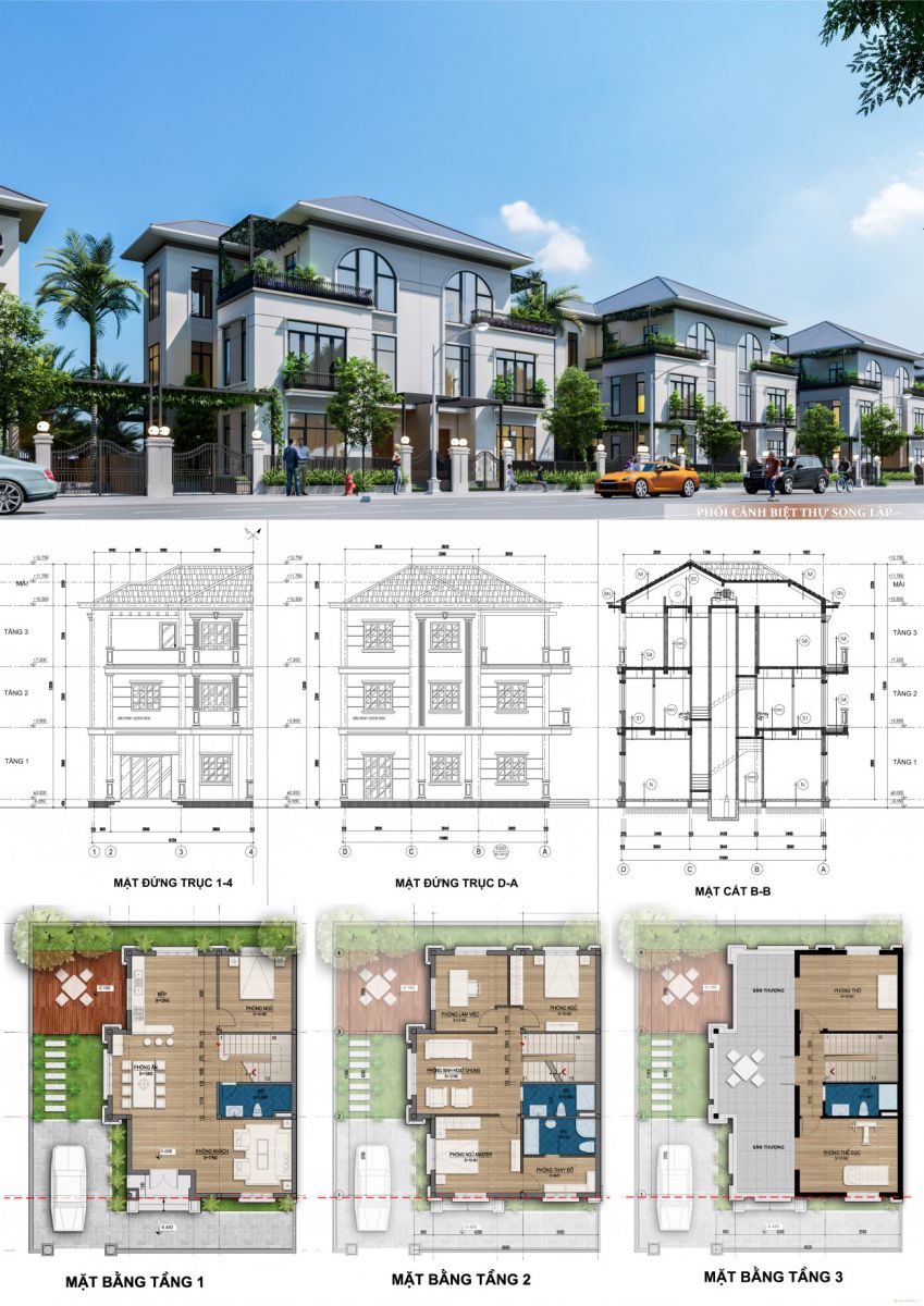 Nhà ở song lập: 44 nhà biệt thự song lập, cao 3 tầng, tổng diện tích là 8.181,4 m2